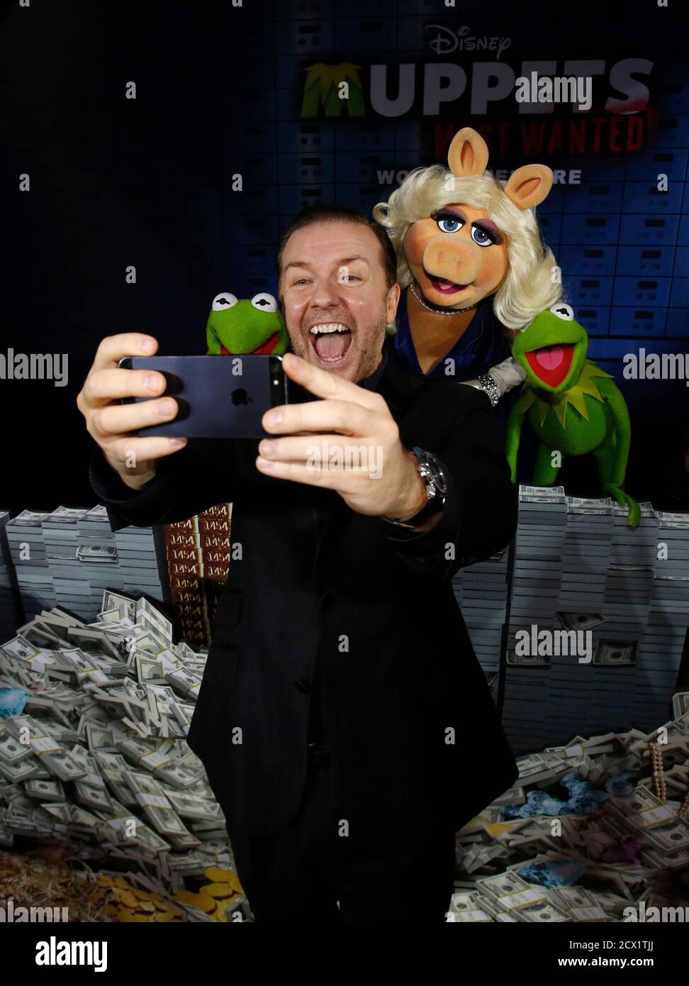 Cast Member Ricky Gervais Takes A Selfie With The Characters Of Constantine Miss Piggy And Kermit At The Premiere Of Muppets Most Wanted At El Capitan Theatre In Hollywood California March 11